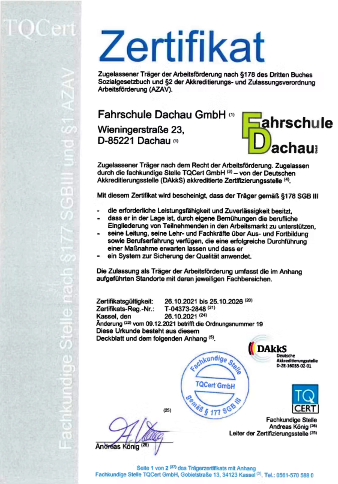 Die Fahrschule Dachau GmbH ist AZAV-zertifiziert, was bedeutet, dass unsere Kurse offiziell anerkannt und förderfähig sind.